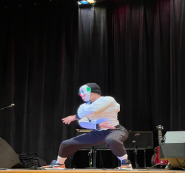 For the third act, we had “The mystery clown.” He engaged the crowd with his performative act. The mystery clown was wearing a clown mask, a beanie, stuffed body muscles, sweats, and sneakers. He showed off his muscles, flexing and striking cool poses, while the song “Poker Face” by Lady Gaga played. There were many cheers and laughs for “The mystery clown.”